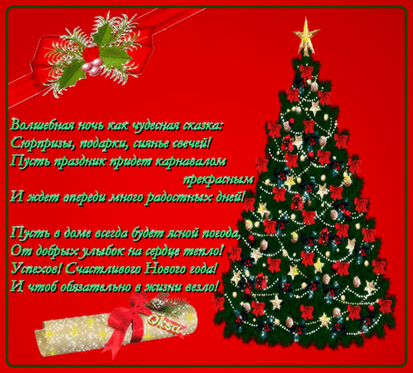 Пускай ветра утихнут, закончится декабрь И фейерверки вспыхнут – как сотнями «эскадр», Чтоб Новый год пришедший вновь подарил тебе Удачи сумасшедшей и радости в судьбе! Чтоб сбылось все, что хочешь, чтоб жилось хорошо, Чтоб праздник напророчил, конечно, волшебство, А также, непременно, терпения, добра, Работы вдохновенной, сердечного тепла!